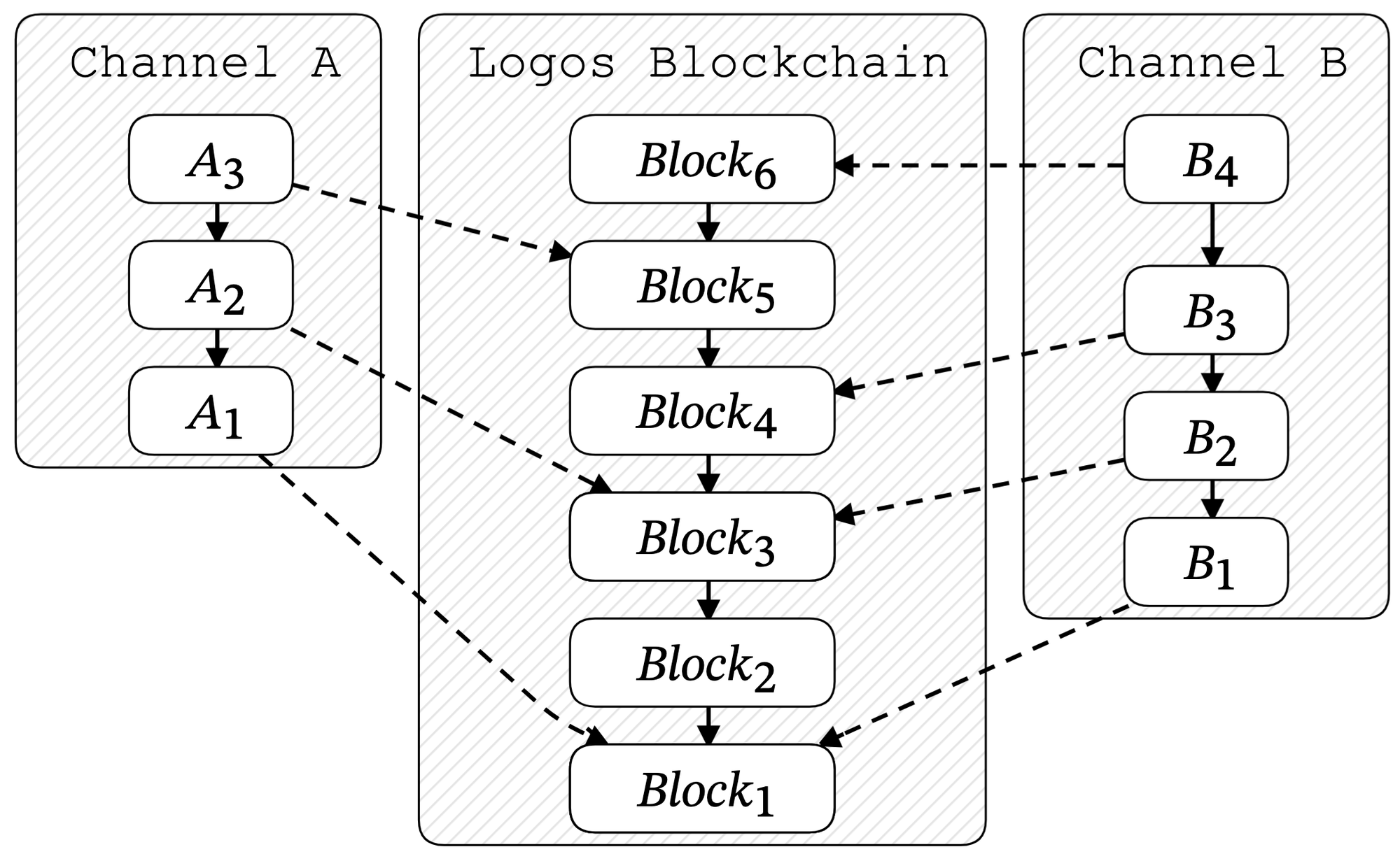 The purpose of Mantle channels on Cryptarchia is to immediately enforce the correct ordering of transactions. These channels form virtual “chains” on top of the Logos Blockchain, with each transaction in a channel referencing its predecessor via a hash. Mantle channels ensure that their transactions will eventually be included on-chain in the correct order, regardless of how the Logos Blockchain may fork or reorganise. This allows new transactions that depend on earlier ones to be submitted immediately, without waiting for finality. An example with two channels is shown below in Figure 1.
